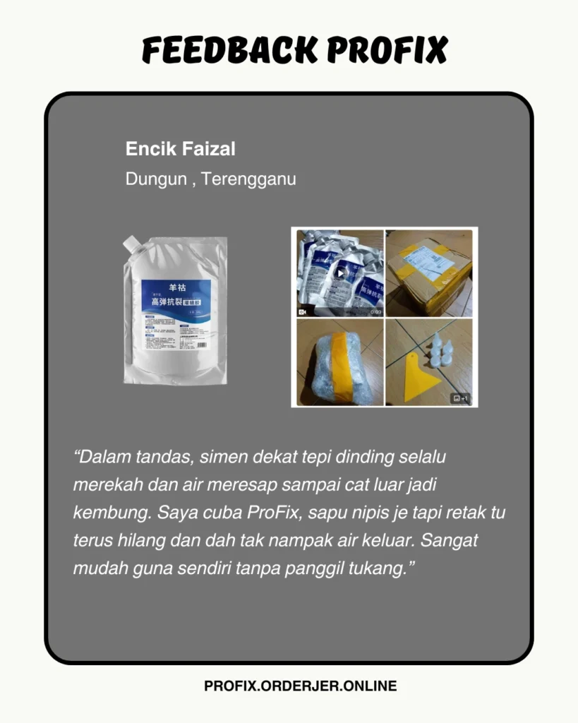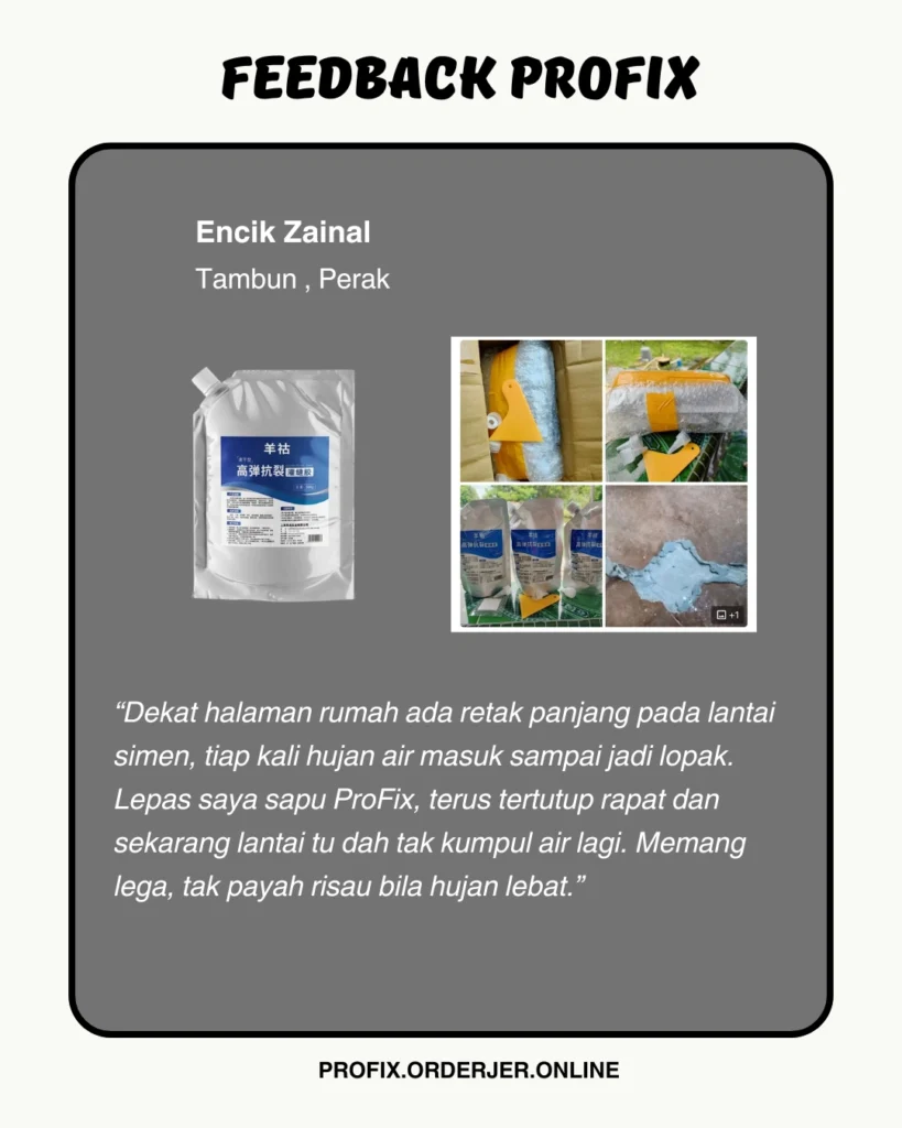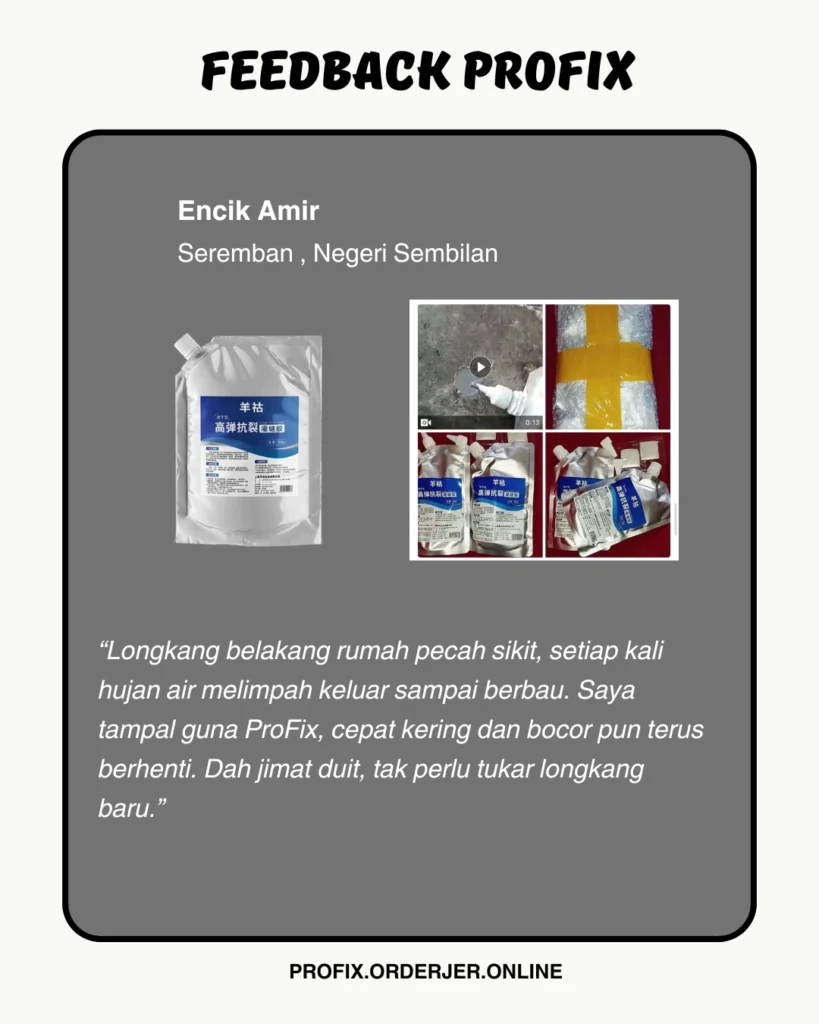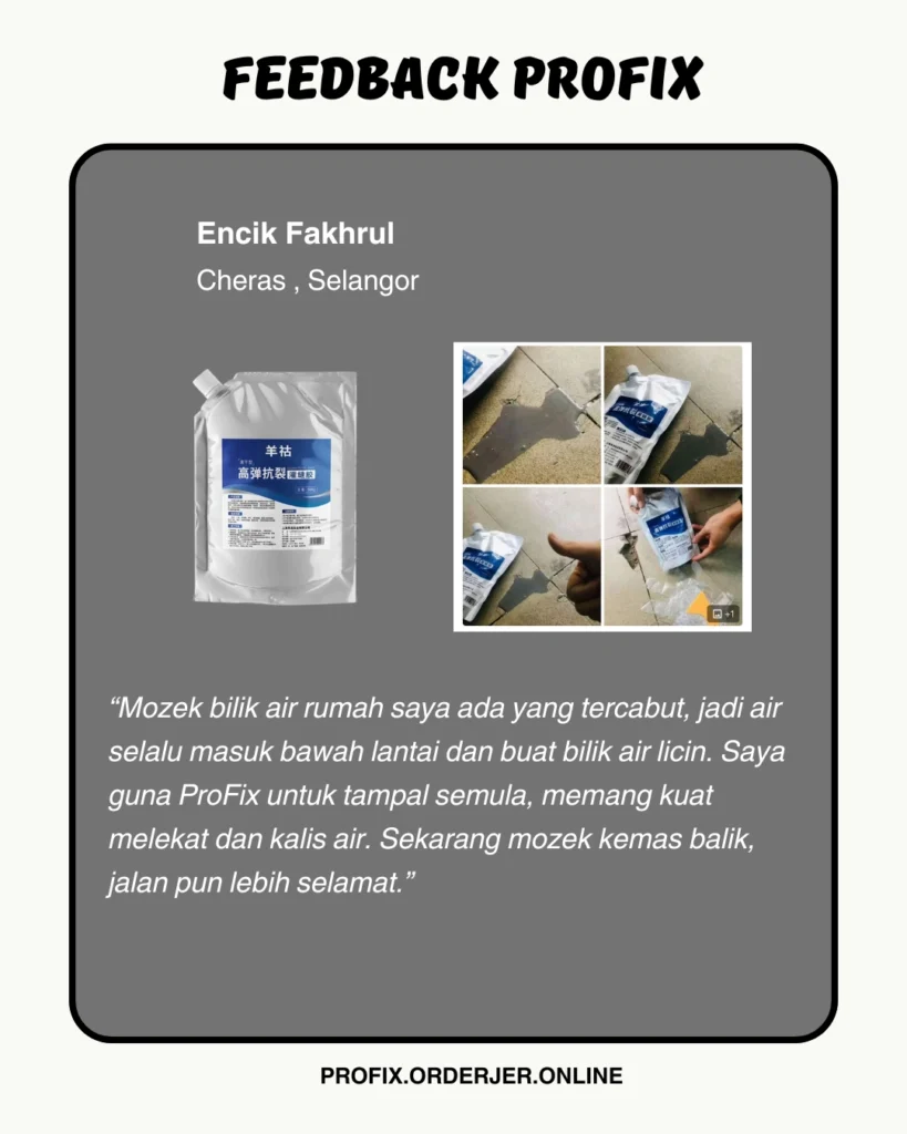 ✔️ ProFix wajib ada di setiap rumah! Gam moden serbaguna – baiki simen retak, mozek bilik air tercabut, longkang pecah & kebocoran kecil dengan cepat. Formula cepat kering, kalis air 100%, fleksibel ikut suhu & hasil kemasan serasi warna. DIY mudah tanpa tukang – rumah kekal kukuh, kemas & selamat setiap hari.